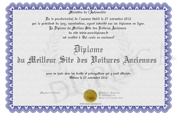 Envoyez par email votre Diplôme du Meilleur Site des Voitures Anciennes personalisé