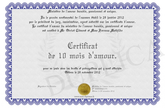 Envoyez par email votre Certificat de 10 mois d'amour. personalisé