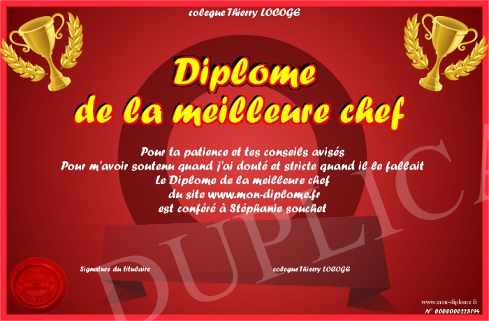 Envoyez par email votre Diplome de la meilleure chef personalisé