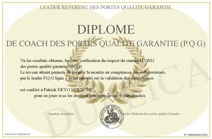 Envoyez par email votre Diplôme de Coach des Portes Qualite Garantie (P.Q.G) personalisé