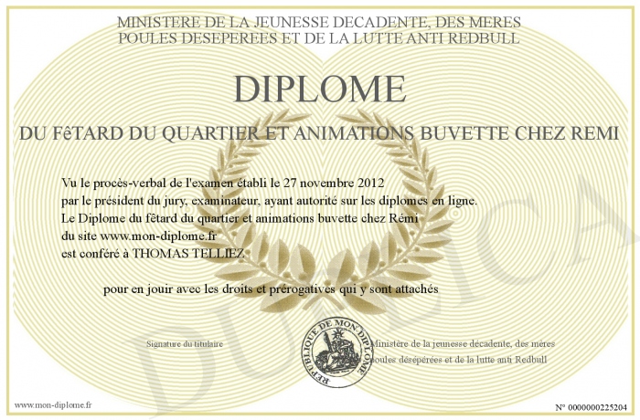 Envoyez par email votre Diplôme du fêtard du quartier et animations buvette chez Rémi personalisé