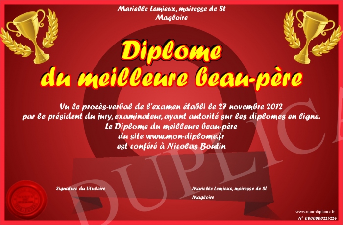 Envoyez par email votre Diplôme du meilleure beau-père personalisé