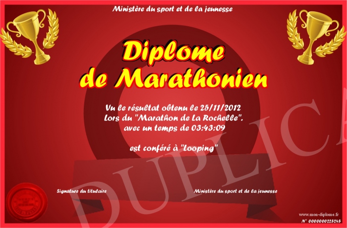 Envoyez par email votre Diplome de Marathonien personalisé