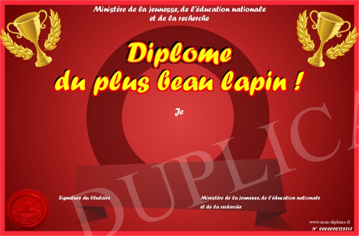Envoyez par email votre Diplôme du plus beau lapin ! personalisé