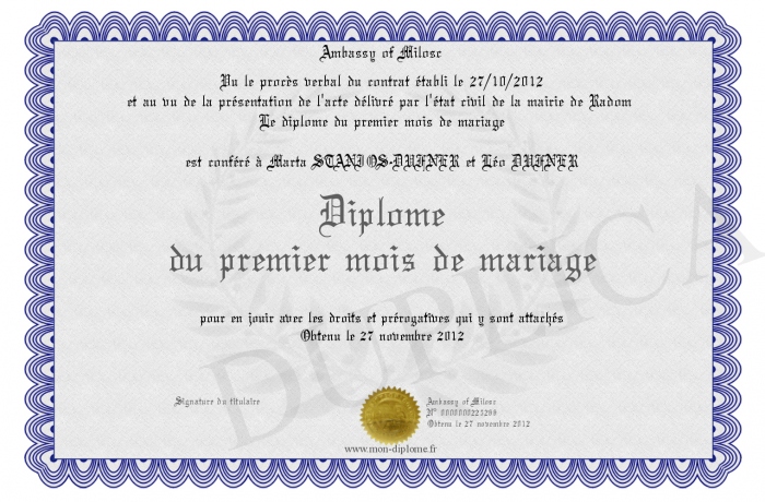 Envoyez par email votre Diplôme du premier mois de mariage personalisé