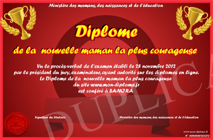 Envoyez par email votre Diplôme de la nouvelle maman la plus courageuse personalisé