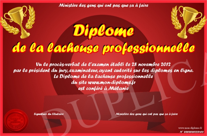 Envoyez par email votre Diplôme de la lacheuse professionnelle personalisé