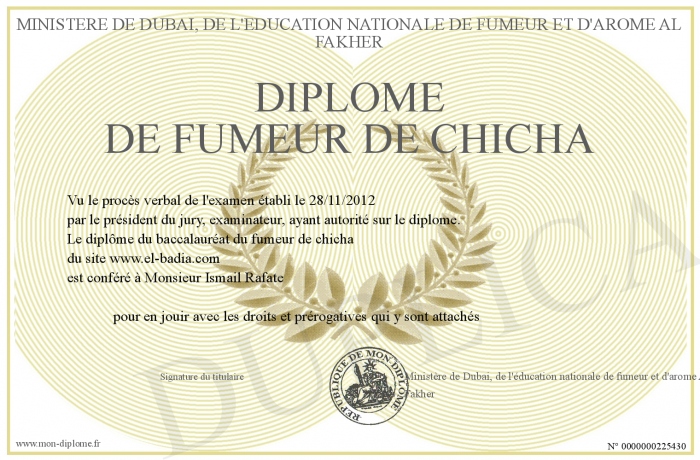 Envoyez par email votre Diplôme de fumeur de chicha personalisé