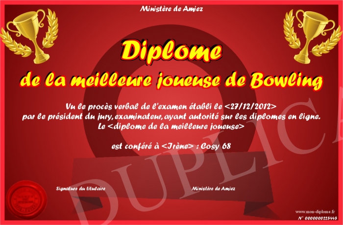 Envoyez par email votre Diplôme de la meilleure joueuse de Bowling personalisé