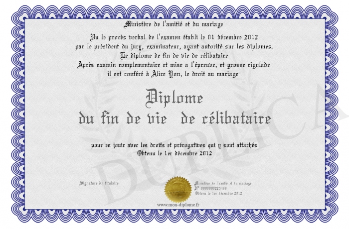 Envoyez par email votre Diplôme du fin de vie de célibataire personalisé