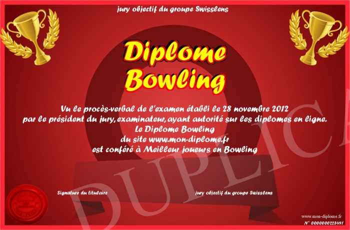 Envoyez par email votre Diplôme Bowling personalisé