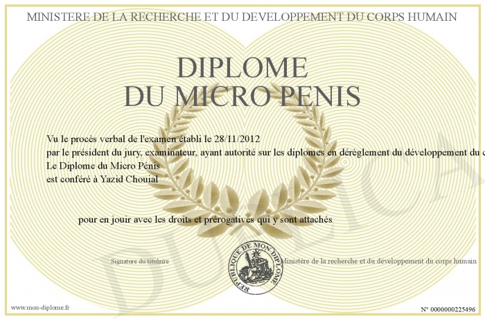 Envoyez par email votre Diplôme du Micro Pénis personalisé