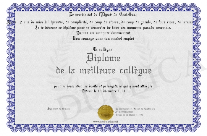 Envoyez par email votre Diplôme de la meilleure collègue personalisé