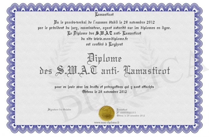 Envoyez par email votre Diplôme des S.W.A.T anti- Lamasticot personalisé