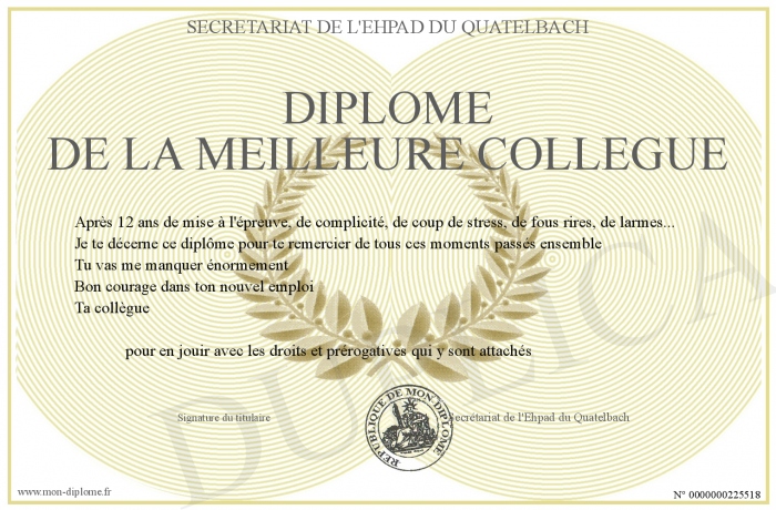 Envoyez par email votre Diplôme de la meilleure collègue personalisé