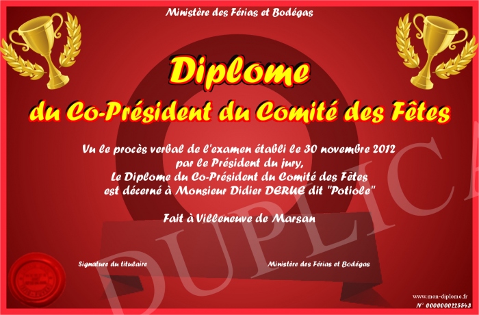 Envoyez par email votre Diplôme du Co-Président du Comité des Fêtes personalisé