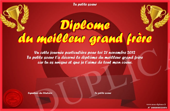 Envoyez par email votre Diplôme du meilleur grand frère personalisé