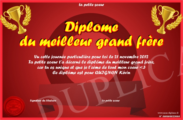 Envoyez par email votre Diplôme du meilleur grand frère personalisé