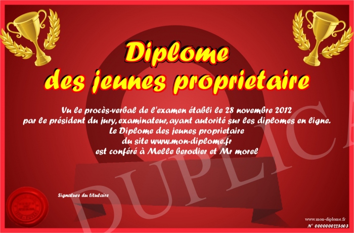 Envoyez par email votre Diplôme des jeunes proprietaire personalisé