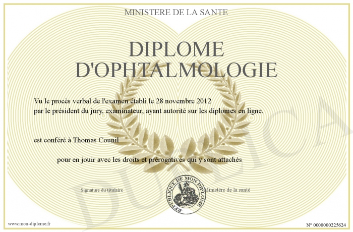 Envoyez par email votre Diplôme d'ophtalmologie personalisé