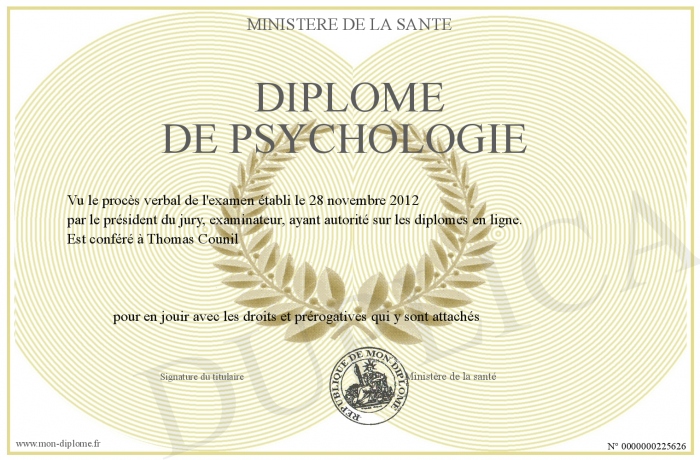 Envoyez par email votre Diplôme de Psychologie personalisé