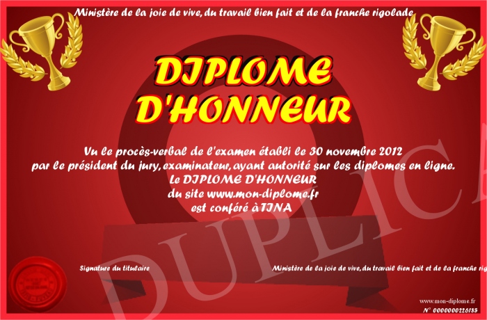 Envoyez par email votre DIPLOME D'HONNEUR personalisé