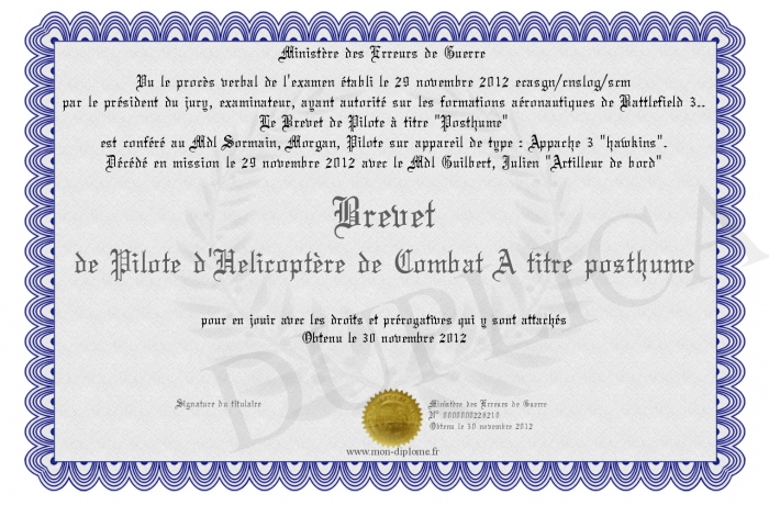Envoyez par email votre Brevet de Pilote d'Helicoptère de Combat A titre posthume personalisé