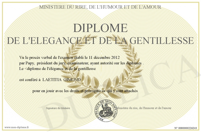 Envoyez par email votre Diplome de l'elegance et de la gentillesse personalisé