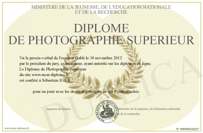 Envoyez par email votre Diplôme de Photographie Supérieur personalisé