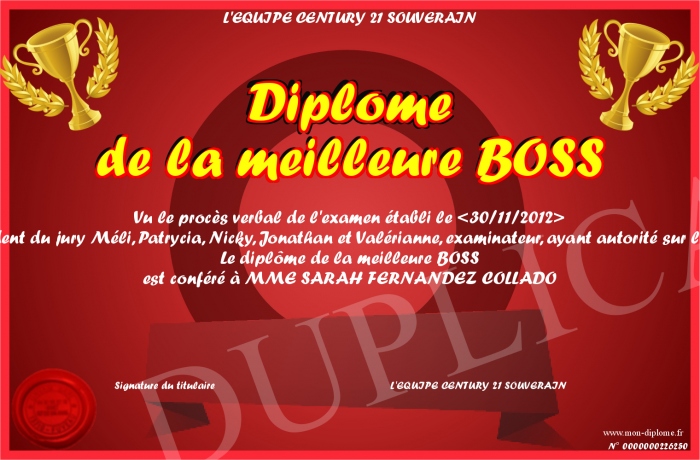 Envoyez par email votre Diplôme de la meilleure BOSS personalisé
