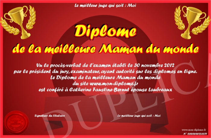 Envoyez par email votre Diplôme de la meilleure Maman du monde personalisé