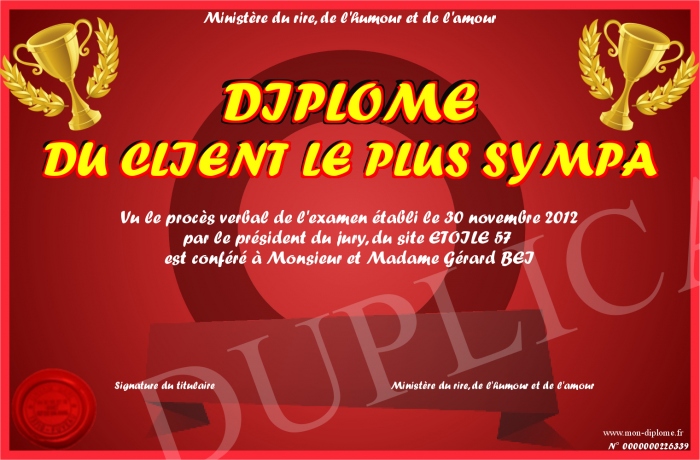 Envoyez par email votre DIPLOME DU CLIENT LE PLUS SYMPA personalisé