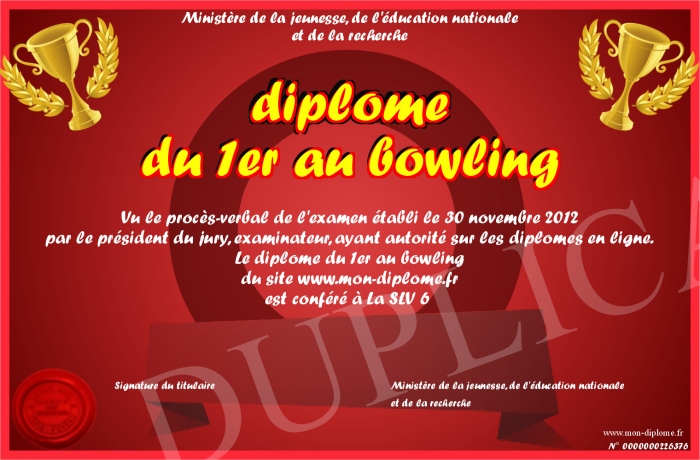 Envoyez par email votre diplôme du 1er au bowling personalisé