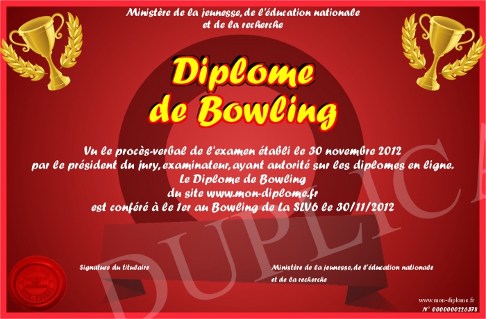 Envoyez par email votre Diplôme de Bowling personalisé
