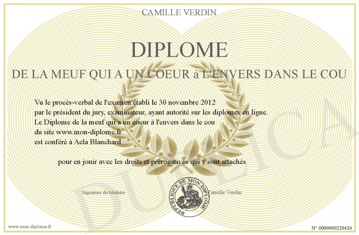 Envoyez par email votre Diplome de la meuf qui a un coeur à l'envers dans le cou personalisé