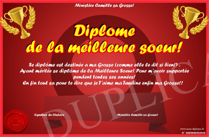 Envoyez par email votre Diplome de la meilleure soeur! personalisé