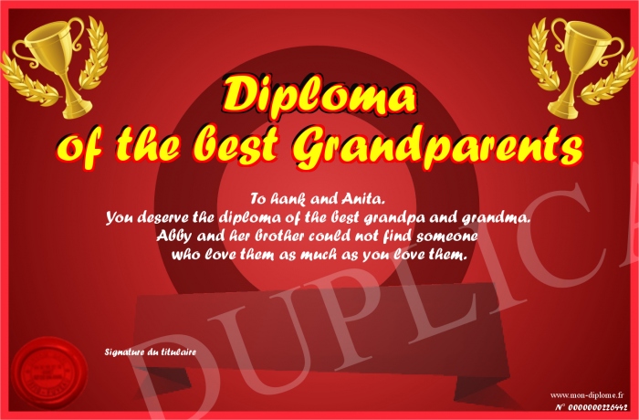 Envoyez par email votre Diploma of the best Grandparents personalisé