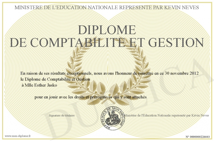 Envoyez par email votre Diplôme de Comptabilité et Gestion personalisé