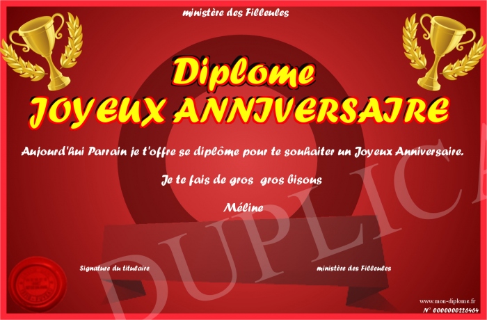 Envoyez par email votre Diplôme JOYEUX ANNIVERSAIRE personalisé