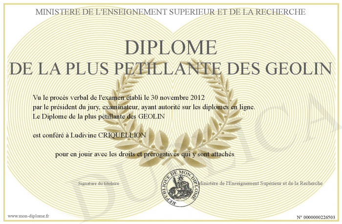 Envoyez par email votre Diplôme de la plus pétillante des GEOLIN personalisé