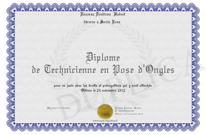 Envoyez par email votre Diplôme de Technicienne en Pose d'Ongles personalisé
