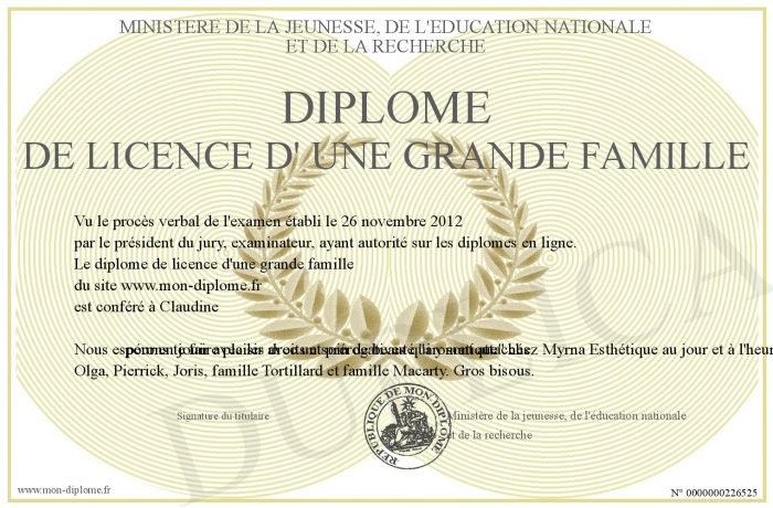 Envoyez par email votre Diplome de licence d' une grande famille personalisé