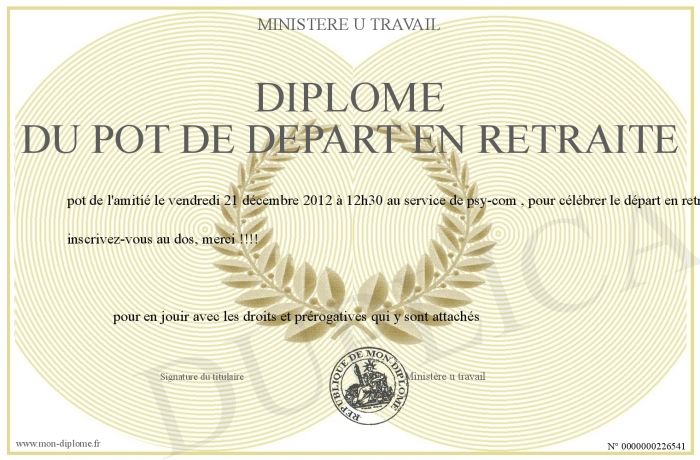 Envoyez par email votre Diplôme du pot de départ en retraite personalisé