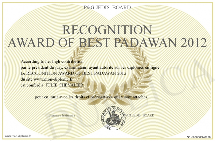 Envoyez par email votre RECOGNITION AWARD OF BEST PADAWAN 2012 personalisé