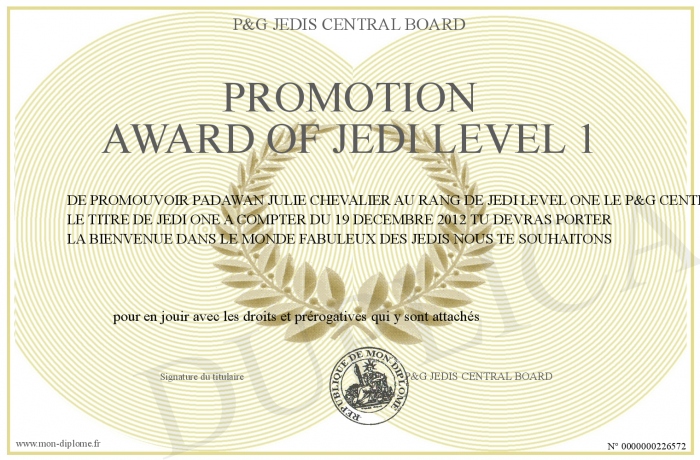 Envoyez par email votre PROMOTION AWARD OF JEDI LEVEL 1 personalisé