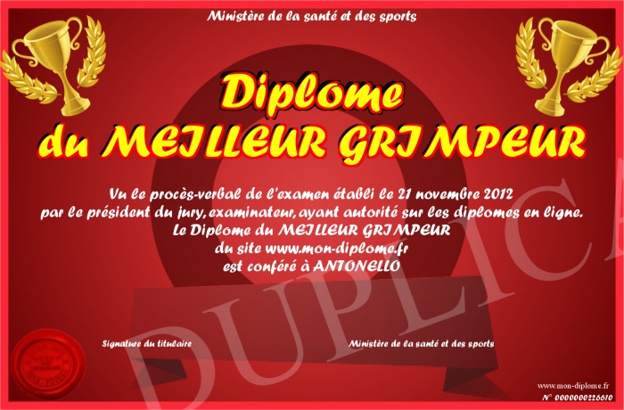 Envoyez par email votre Diplôme du MEILLEUR GRIMPEUR personalisé