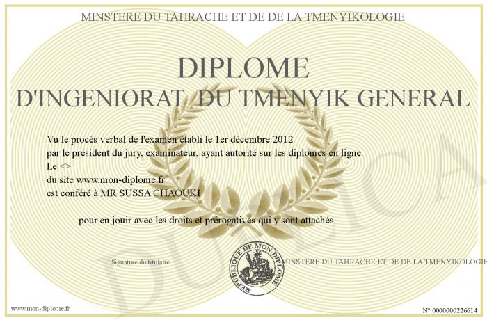 Envoyez par email votre DIPLOME D'INGENIORAT DU TMENYIK GENERAL personalisé