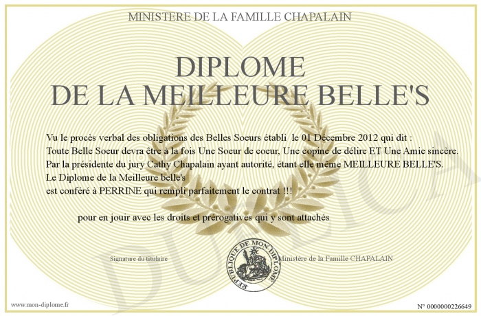 Envoyez par email votre Diplôme de la Meilleure belle's personalisé