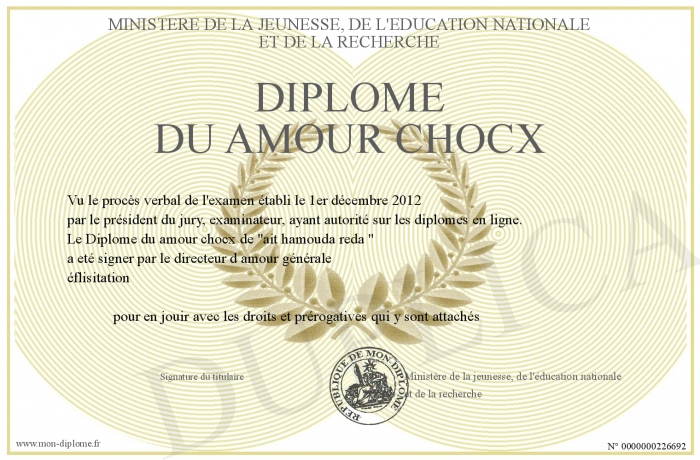 Envoyez par email votre Diplôme du amour chocx personalisé