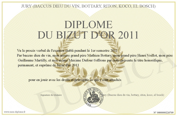 Envoyez par email votre Diplôme du Bizut d'or 2011 personalisé